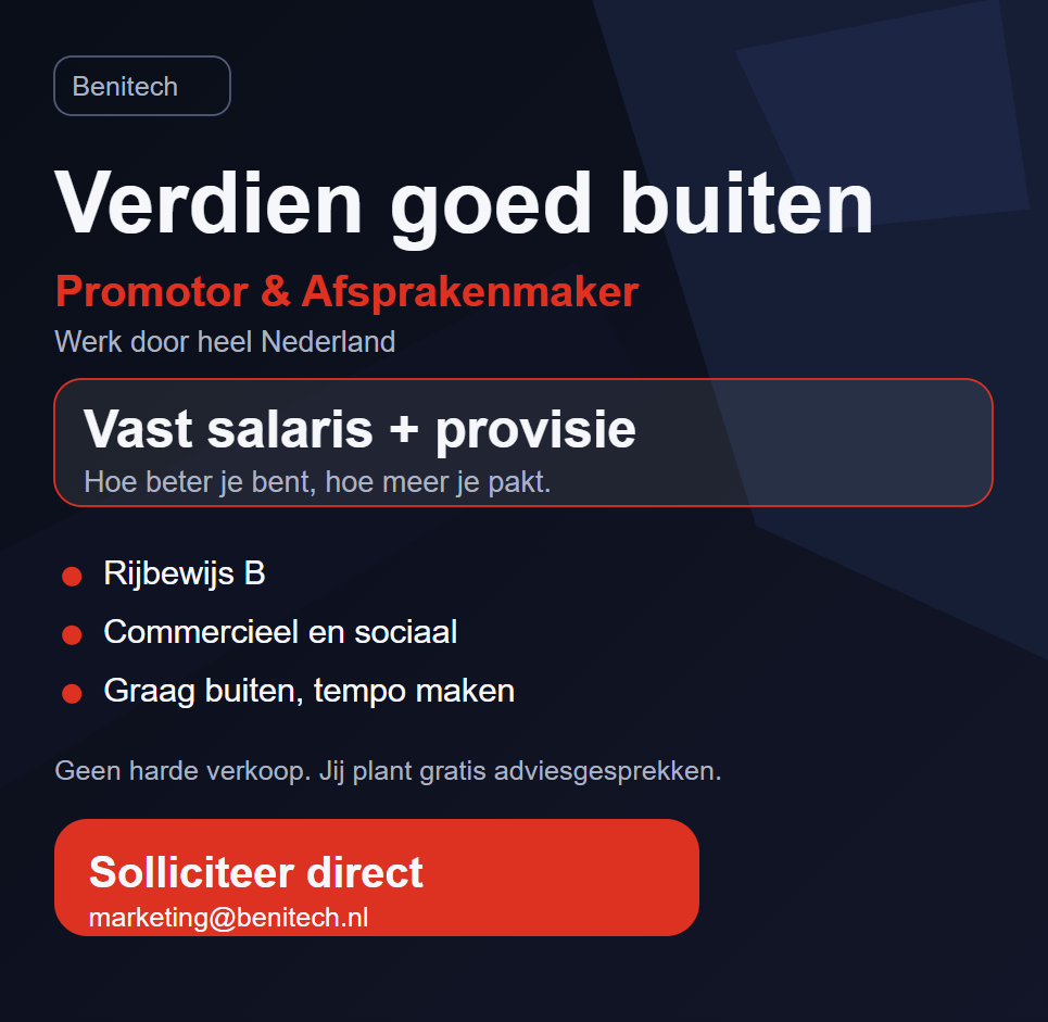 Ben jij graag buiten, hou je van veel geld verdienen, vrijheid en praat je makkelijk met mensen? Dan is dit jouw baan! Als promotor bij Benitech ga je langs woningen en maak je afspraken voor onze verkopers. Jij hoeft niet “hard te verkopen”. Jij zorgt dat we bij geïnteresseerde mensen een gratis adviesgesprek mogen inplannen.